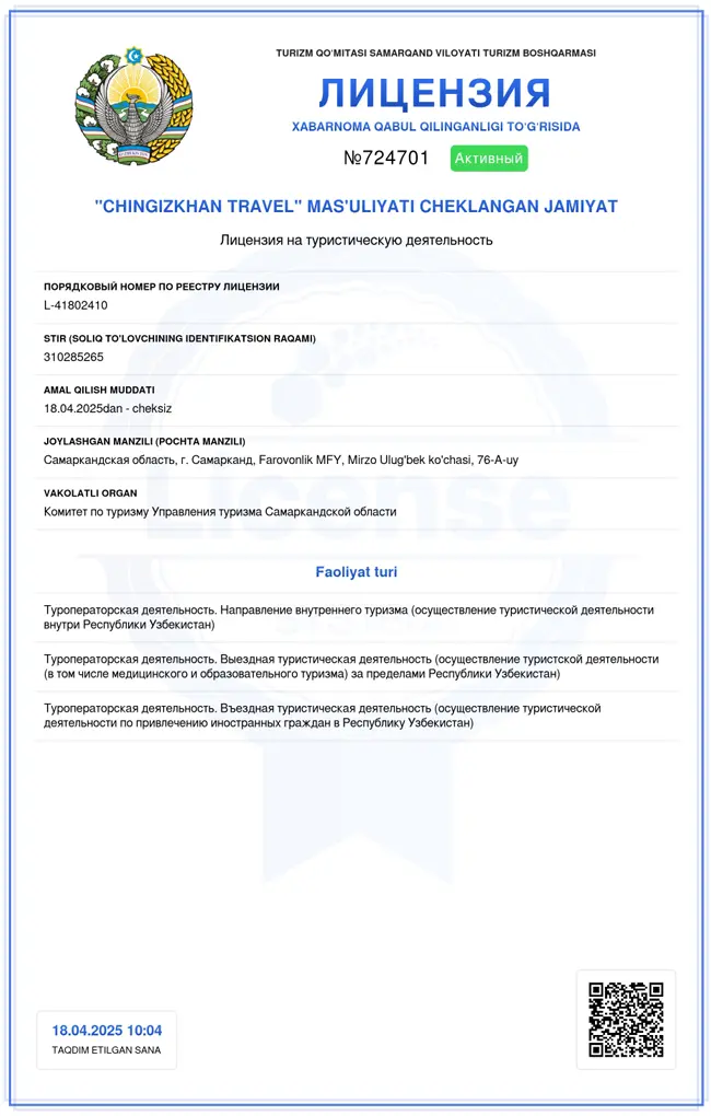 Chingizkhan Travel is a locally based tour agency in Uzbekistan dedicated to creating authentic, comfortable, and memorable travel experiences. We combine deep cultural knowledge with a passion for showcasing the beauty, history, and traditions of our homeland. Every itinerary is thoughtfully designed, tested, and refined to ensure travelers enjoy a true connection with the places they visit.