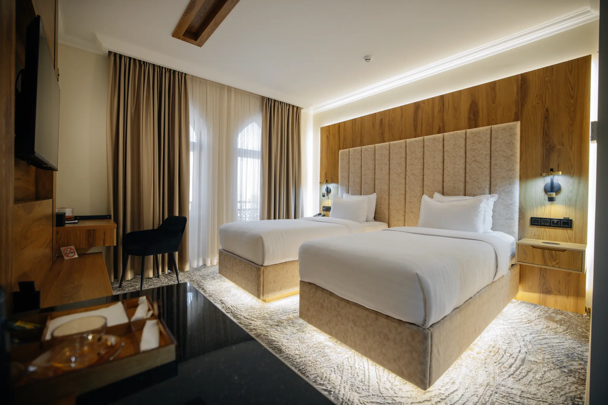 The room rate includes the following services: buffet breakfast, free Wi-Fi, 24-hour front desk, daily room cleaning, access to the sauna/spa (Turkish hammam, Finnish steam room), access to the fitness center, outdoor and indoor pool.